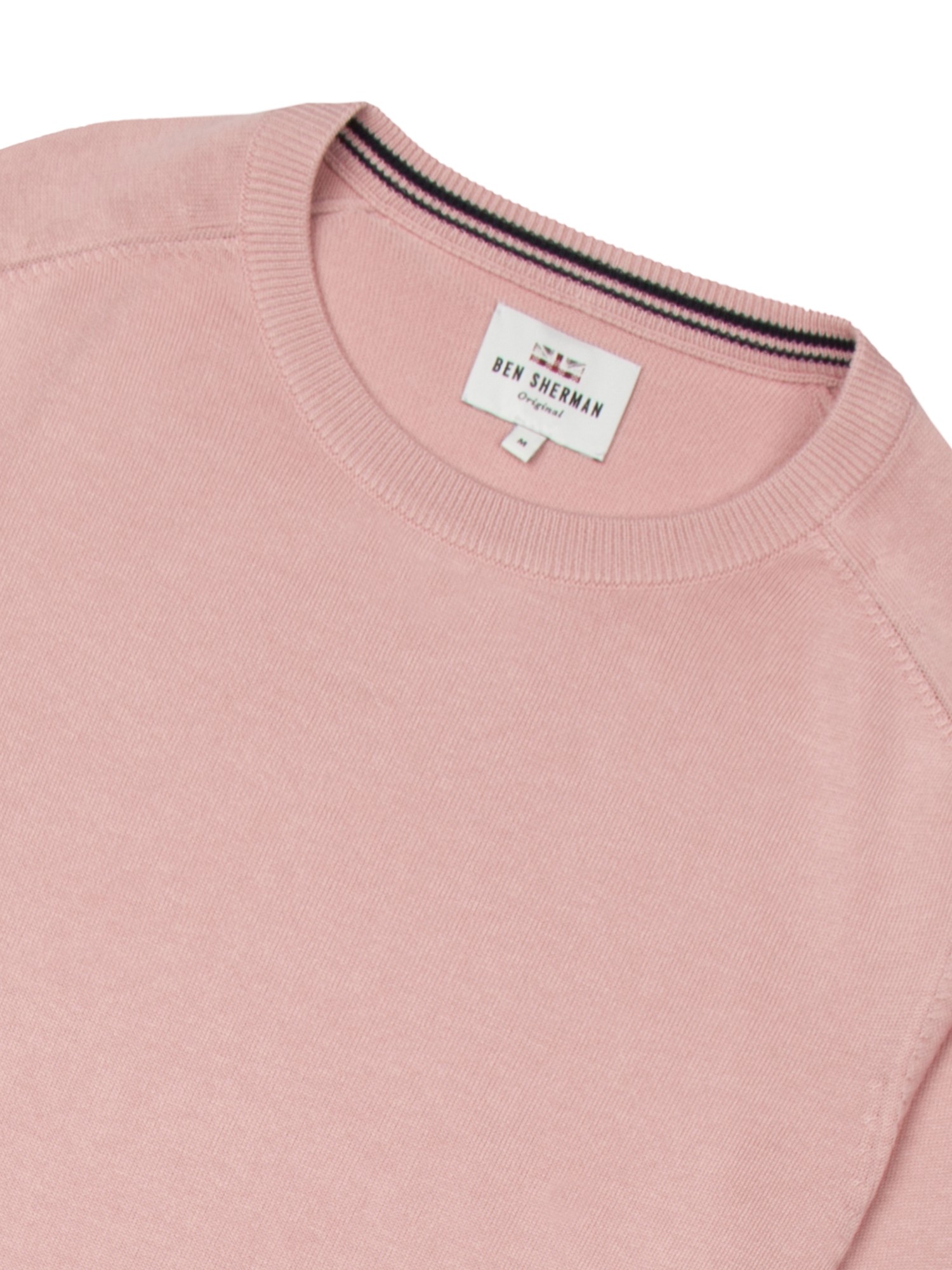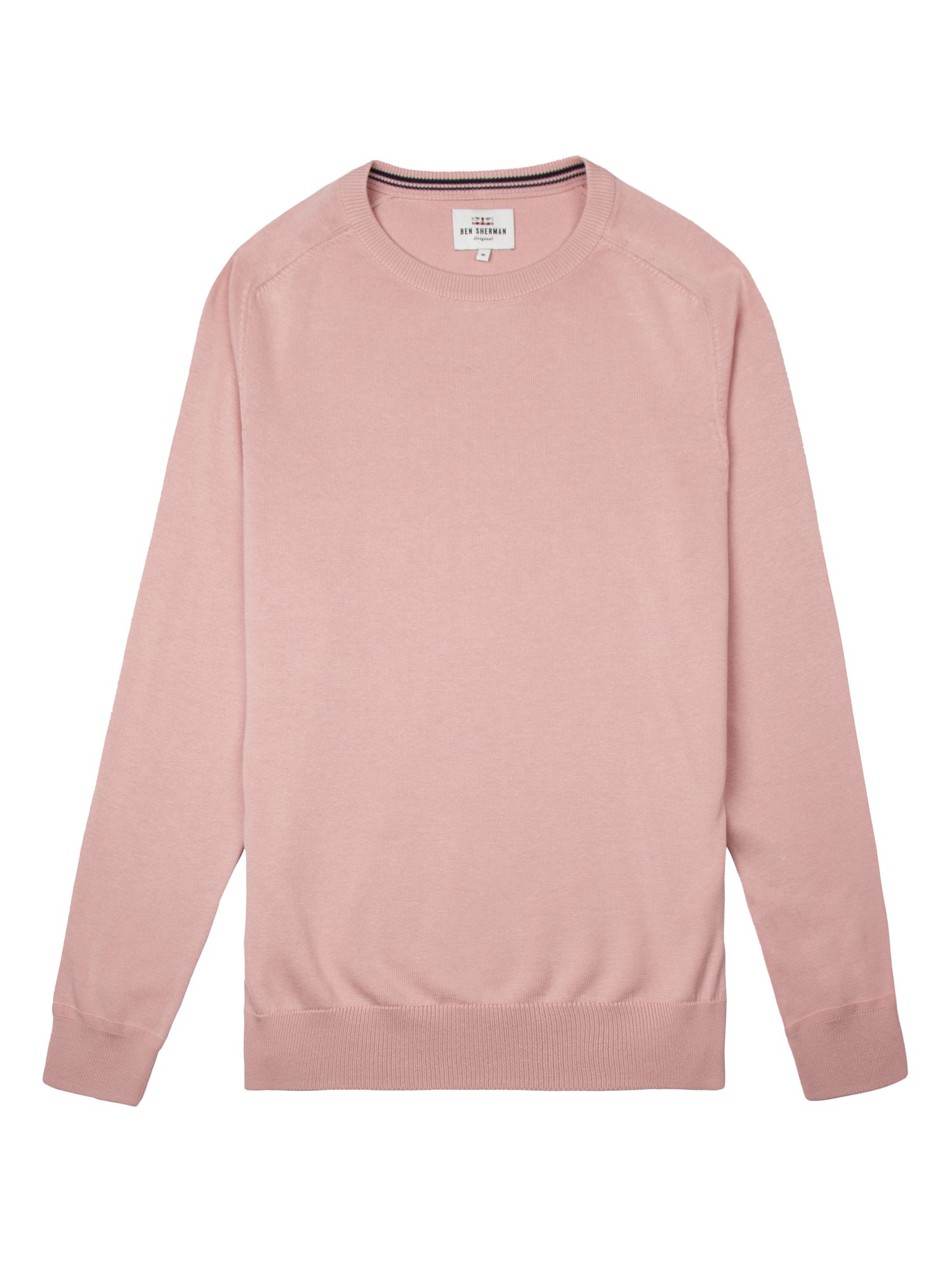100% Cotton, 14gg with Bio Finish crew neck jumper with link stitch detail at sides and fully fashioned saddle raglan sleeves.