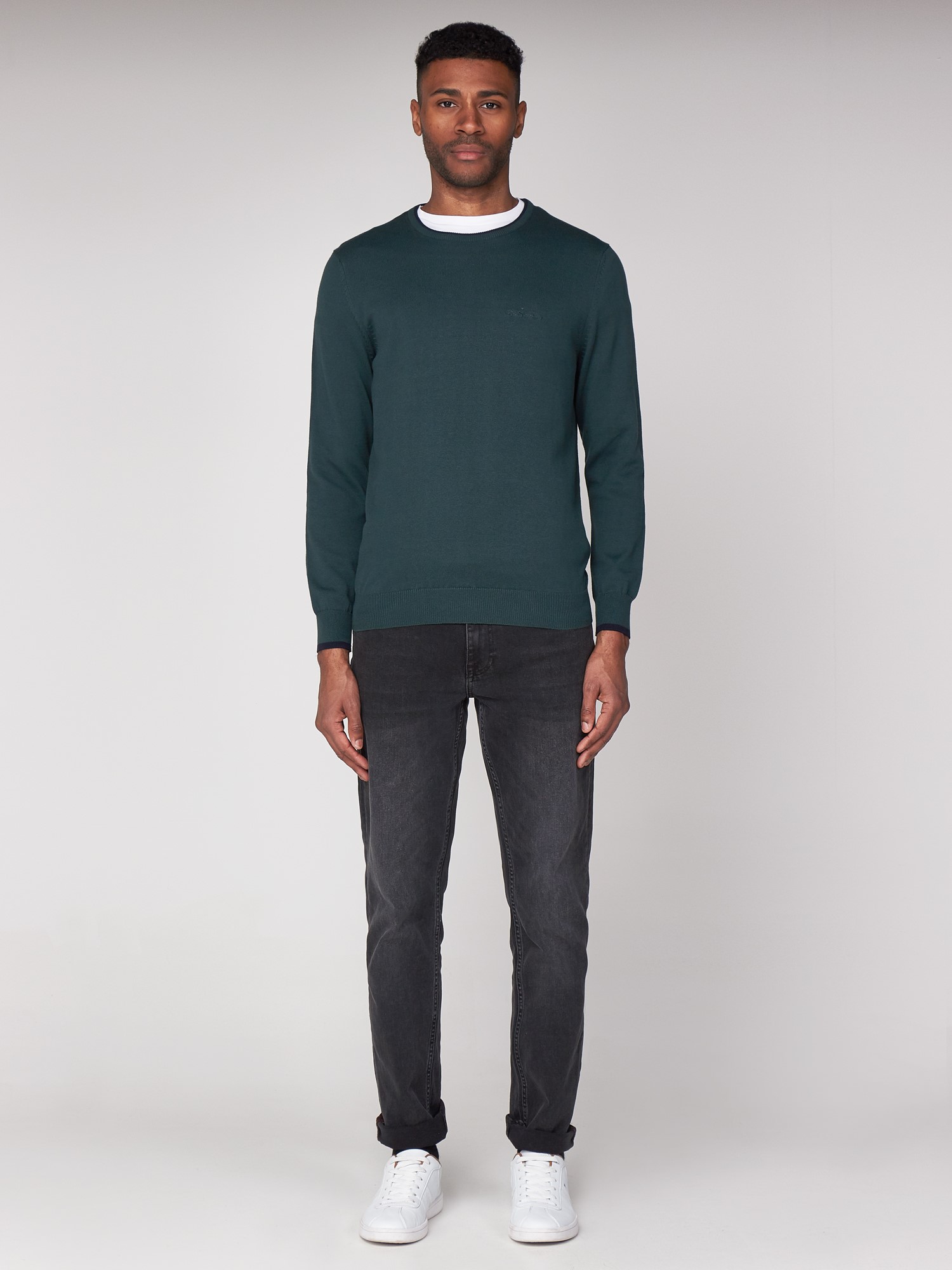 The classic Ben Sherman crew neck jumper with outer edge neck tipping and chest embroidered branding.