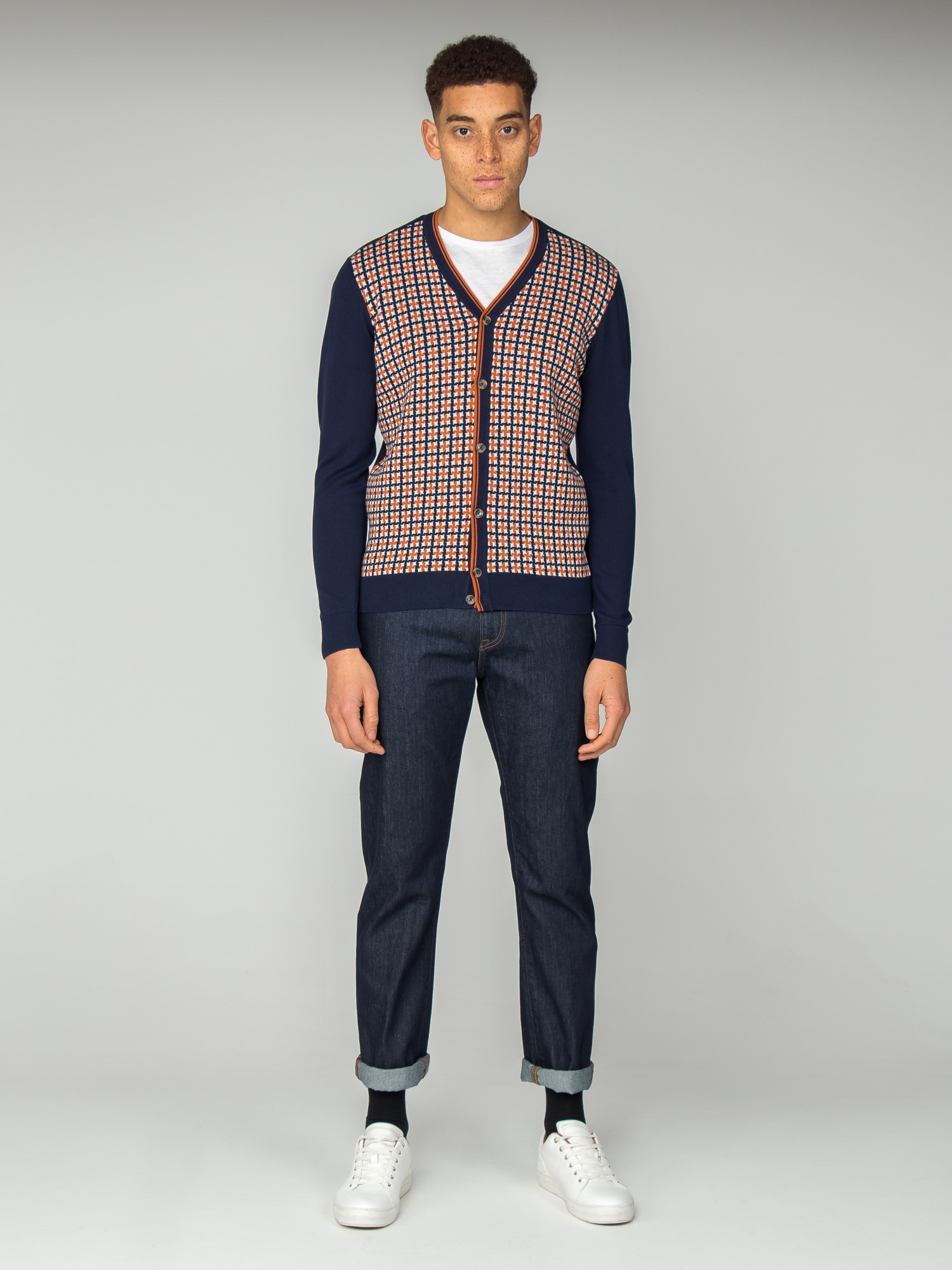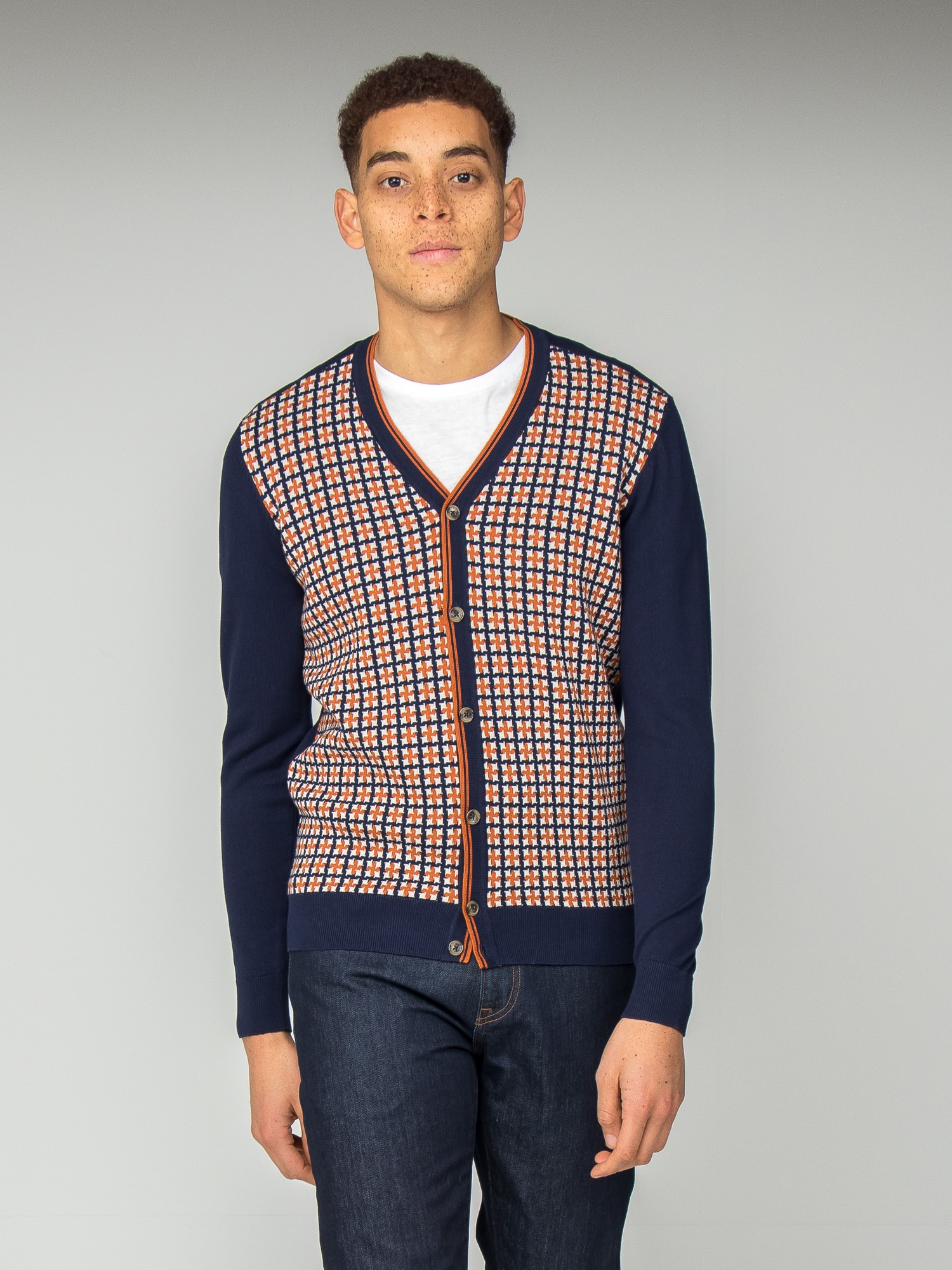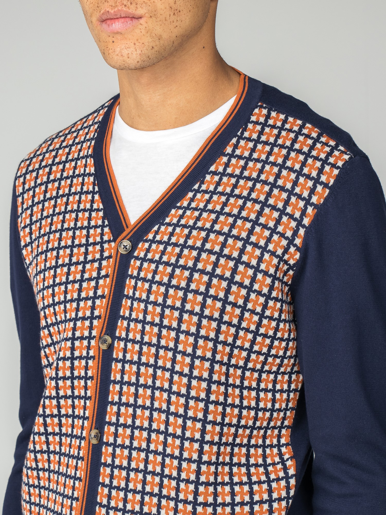 100% Cotton plain knit cardigan with jacquard front pattern.