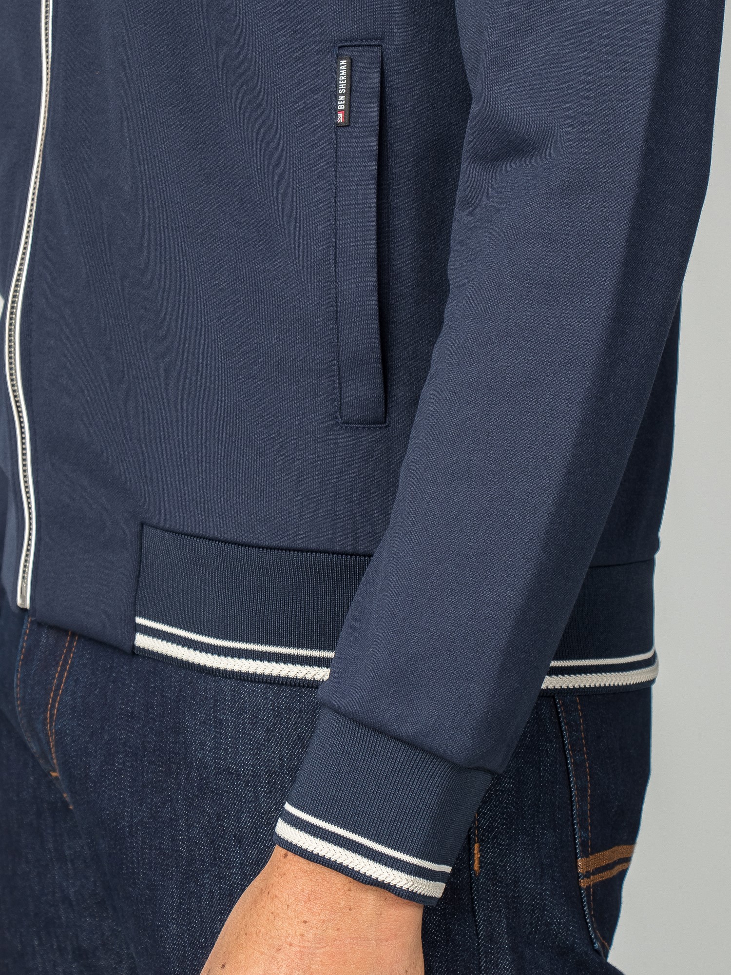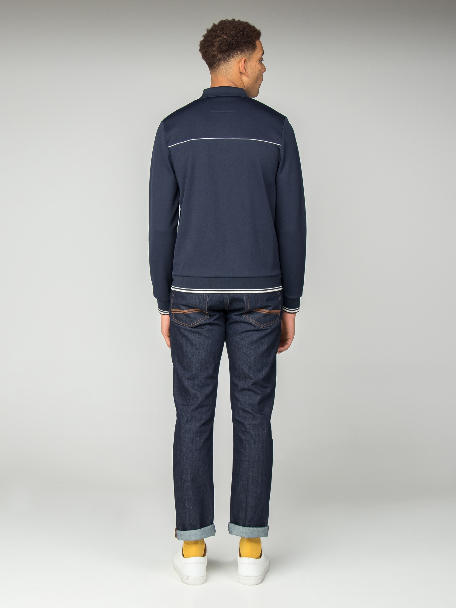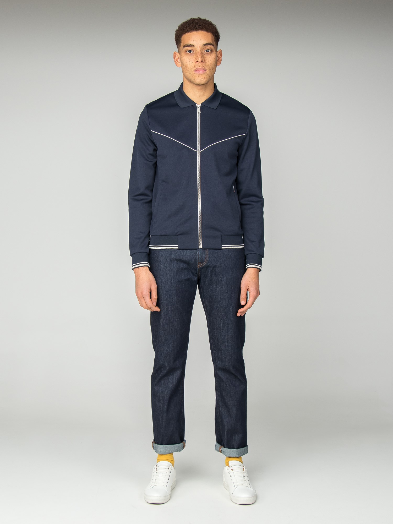 Retro zip through tricot track top with a tipped cuff and hem and piping detail at the chest.